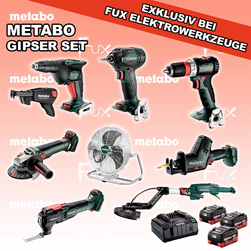 Zu "Gipser Set" von Metabo FULL Service: 36 Monate zum Nulltarif für Sie! Weitere Infos zum FULL Service FUX SPECIAL EXKLUSIV BEI FUX Metabo Gipser Set 11 Bestell- und Artikelnummer: Gipser Set 11 BS 18 L BL Q Akku-BohrschrauberAkkuspannung 18 V Drehzahl 0 - 500 / 0 - 1700 /min Drehmoment hart / weich 60 / 28 Nm Gewicht (mit Akkupack) 1.3 kgInfos TBS 18 LTX BL 5000 Akku-TrockenbauschrauberAkkuspannung 18 V Leerlaufdrehzahl 0 - 5.000 /min Max. Drehmoment weich 6 Nm Gewicht mit Akkupack 1,3 kgInfos SSD 18 LTX 200 BL Akku-Schlagschrauber Akkuspannung 18 V Anziehdrehmoment 200 Nm Werkzeugaufnahme 1/4" Gewicht 1.3 kgInfos WVB 18 LT BL 11-125 Quick Akku-WinkelschleiferAkkuspannung 18 V Drehzahl 2.800 - 10.000 / min Ø 125 mm Scheiben Gewicht (mit Akkupack) 2.5 kgInfos SSE 18 LTX BL Compact Akku-SäbelsägeAkkuspannung 18 V Hubzahl 0-3000 min-1 Hublängen 16 mm Gewicht (mit Akkupack) 1.8 kgInfos MT 18 LTX BL QSL Akku-Multitool Akkuspannung 18 V Schwingzahl bei Leerlauf 8.000 - 20.000 /min Schleifplatte, Maß Eck zu Eck 93 mm Gewicht 1.7 kgInfos AV 18 Akku-VentilatorAkkuspannung 18 V Max. Luftgeschwindigkeit 3,8 m/s Flügeldurchmesser 355 mm Gewicht (mit Akkupack) 1,2 kgInfos LSV 5-225 Comfort LanghalsschleiferLeistungsaufnahme 500 Watt Durchmesser Schleifteller 225 mm Leerlaufdrehzahl 1000 - 1650 min-1 Gewicht 4.5 kgInfos 3 x 18 V, 5.5 Ah, LiHD Akkupack18 V 5.5 Ah ( LiHD Akkus ) Infos ASC 145, 12 - 36 V "Air Cooled" LadegerätZum Aufladen aller Li-Power Schiebesitz-Akkupacks (12 V - 36 V). Ladestrom 8.0 AInfos Schrauber-Magazin Speed Fix 57Robustes Schrauber-Magazin geeignet für TBS 18 LTX 5000 und HBS 18 LTX 3000Infos Registriere die in diesem Set vorhandenen Metabo Maschinen auf metabo.ch, und ergattere dir bis zu 5 Gratis Akkus!Zusätzlich offerieren wir zu diesem Set einen Gratis Akku! Standard-Ausrüstung In diesem Set enthalten: BS 18 L BL Q Akku-Bohrschrauber TBS 18 LTX BL 5000 Akku-Trockenbauschrauber SSD 18 LTX 200 BL Akku-Schlagschrauber WVB 18 LT BL 11-125 Quick Akku-Winkelschleifer SSE 18 LTX BL Compact Akku-Säbelsäge MT 18 LTX BL QSL Akku-Multitool AV 18 Akku-Ventilator LSV 5-225 Comfort Langhalsschleifer 3 x 18 V, 5.5 Ah, LiHD Akkupack ASC 145, 12 - 36 V "Air Cooled" Ladegerät Schrauber-Magazin Speed Fix 57 Listenpreis CHF 3'385.50 Fuxpreis CHF 2'336.00 inklusive 8.1% MwSt Frankolieferung Kein Grauimport! Produkt bestellen 1 Stück 2 Stück 3 Stück 4 Stück 5 Stück 6 Stück 7 Stück 8 Stück 9 Stück 10 Stück Alle Angaben ohne Gewähr und solange Vorrat reicht!Wiederverkäufer werden? Produkt als PDF NEUHEITAKTION 31%