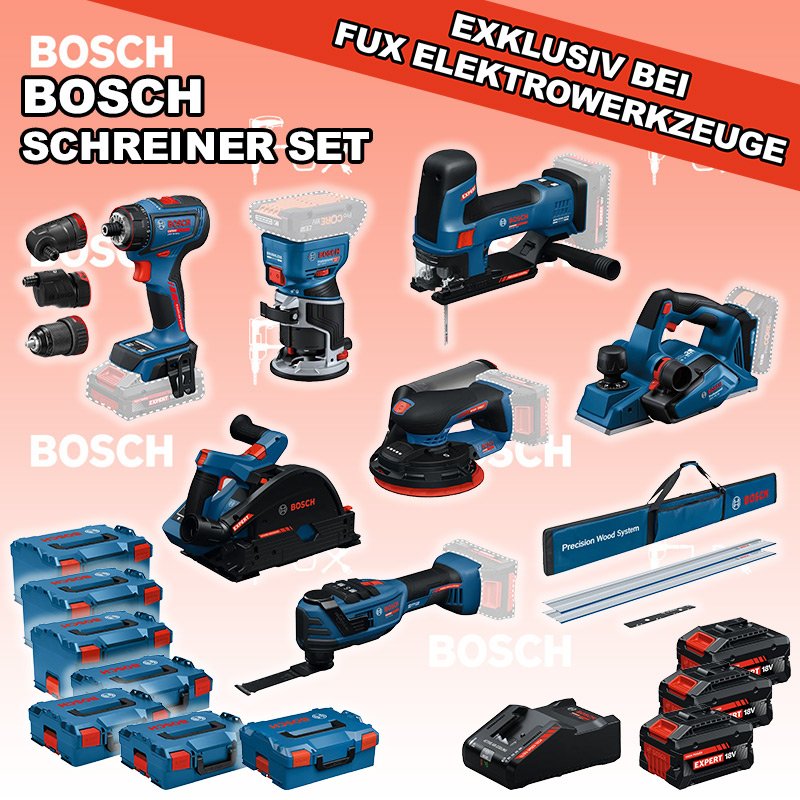 Zu "Schreiner Set" von Bosch Professional FUX SPECIAL EXKLUSIV BEI FUX Bosch Expert EXSchreiner Set 11 Bestell- und Artikelnummer: Bosch Schreiner Set 11 5 Jahre Garantie auf Bosch Expert Maschinen / Zubehör EXST18V-155S Akku-StichsägeAkkuspannung 18 V Hubzahl bei Leerlauf 800 - 3800 min⁻¹ Hubhöhe 26 mm Gewicht exkl. Akku 1.9 kgInfos EXSR18V-90FC Akku-BohrschrauberAkkuspannung 18 V Drehmoment 36 / 65 / - Nm Leerlaufdrehzahl 0 – 630 / 0 – 2100 min⁻¹ Gewicht exkl. Akku 0.92 kgInfos GKF 18V-8 Akku-KantenfräseAkkuspannung 18 V Leerlaufdrehzahl 10000 – 30000 min⁻¹ 6 mm, 8 mm, 1/4'' Gewicht exkl. Akku 1.1 kg Infos EXKT18V-52G Akku-TauchsägeAkkuspannung 18 V Leerlaufdrehzahl 2800 – 5500 min⁻¹ Gewicht exkl. Akku 4.1 kgInfos GHO 18V-26 Akku-EinhandhobelAkkuspannung 18 V Spanabnahme einstellbar 0 - 2.6 mm Infos EXOP18V-40 Akku-Multi-CutterAkkuspannung 18 V Leerlaufschwingzahl 10000 – 20000 min⁻¹ Oszillationswinkel links und rechts 2 ° Gewicht exkl. Akku 1.24 kgInfos EXEX18V-150-5 Akku-ExzenterschleiferAkkuspannung 18 V Schleifteller-Ø 150 mm Leerlaufdrehzahl 5000 – 10000 Umin Schwingzahl 10000 – 20000 min⁻¹ Gewicht exkl. Akku 1.2 kgInfos FSN 1400 Set Führungsschienensysteme Systemzubehör2 x Führungsschiene FSN 1400 Verbindungsstück FSN VEL Tasche FSN BAGInfos 3x EXBA18V-80 + EXAL18V-160 Starter-Set3 x EXBA18V-80 Akkupack EXAL18V-160 LadegerätInfos Standard-Ausrüstung In diesem Set enthalten: EXST18V-155S Akku-Stichsäge EXSR18V-90FC Akku-Bohrschrauber GKF 18V-8 Akku-Kantenfräse EXKT18V-52G Akku-Tauchsäge GHO 18V-26 Akku-Einhandhobel EXOP18V-40 Akku-Multi-Cutter EXEX18V-150-5 Akku-Exzenterschleifer FSN 1400 Set Führungsschienensysteme Systemzubehör 3x EXBA18V-80 + EXAL18V-160 Starter-Set Geliefert im Koffer Zubehör Listenpreis CHF 3'746.60 Fuxpreis CHF 2'890.00 inklusive 8.1% MwSt Kostenloser Versand Kein Grauimport! Produkt bestellen 1 Stück 2 Stück 3 Stück 4 Stück 5 Stück 6 Stück 7 Stück 8 Stück 9 Stück 10 Stück Alle Angaben ohne Gewähr und solange Vorrat reicht! Produkt als PDF NEUHEITAKTION 22%