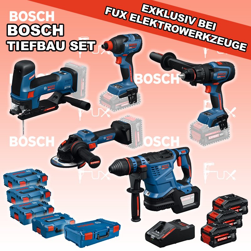 Zu "Bau / Tiefbau Set" von Bosch Professional FUX SPECIAL EXKLUSIV BEI FUX Bosch Expert EXTiefbau Set 1 Bestell- und Artikelnummer: EXTiefbau Set 1 5 Jahre Garantie auf Bosch Expert Maschinen / Zubehör EXSR18V-150 Akku-BohrschrauberAkkuspannung 18 V Drehmoment 84 / 100 / 150 Nm Leerlaufdrehzahl 0 – 550 / 0 – 2200 min⁻¹ Gewicht exkl. Akku 2.1 kgInfos EXBH18V-32F Akku-BohrhammerAkkuspannung 18 V Nenn-Schlagenergie 4.5 J Schlagzahl bei Nenndrehzahl 4300 bpm Nenndrehzahl 0 – 790 min⁻¹ Gewicht exkl. Akku 4.2 kgInfos EXDX18V-210 Akku-DrehschlagschrauberAkkuspannung 18 V Drehmoment. max. 210 Nm Leerlaufdrehzahl 0 - 1100 / 0 - 1700 / 0 - 2300 min⁻¹ Schlagzahl 0 - 4000 bpm Gewicht exkl. Akku 1.2 kgInfos EXST18V-155S Akku-StichsägeAkkuspannung 18 V Hubzahl bei Leerlauf 800 - 3800 min⁻¹ Hubhöhe 26 mm Gewicht exkl. Akku 1.9 kgInfos EXWS18V-15S Akku-WinkelschleiferAkkuspannung 18 V Leerlaufdrehzahl 11000 min⁻¹ Scheiben-Ø 125 mm Gewicht exkl. Akku 2.2 kgInfos 3x EXBA18V-80 + EXAL18V-160 Starter-Set3 x EXBA18V-80 Akkupack EXAL18V-160 LadegerätInfos Standard-Ausrüstung In diesem Set enthalten: EXSR18V-150 Akku-Bohrschrauber EXBH18V-32F Akku-Bohrhammer EXDX18V-210 Akku-Drehschlagschrauber EXST18V-155S Akku-Stichsäge EXWS18V-15S Akku-Winkelschleifer 3x EXBA18V-80 + EXAL18V-160 Starter-Set Geliefert im Koffer Zubehör Listenpreis CHF 2'675.70 Fuxpreis CHF 2'085.00 inklusive 8.1% MwSt Kostenloser Versand Kein Grauimport! Produkt bestellen 1 Stück 2 Stück 3 Stück 4 Stück 5 Stück 6 Stück 7 Stück 8 Stück 9 Stück 10 Stück Alle Angaben ohne Gewähr und solange Vorrat reicht! Produkt als PDF NEUHEITAKTION 22%
