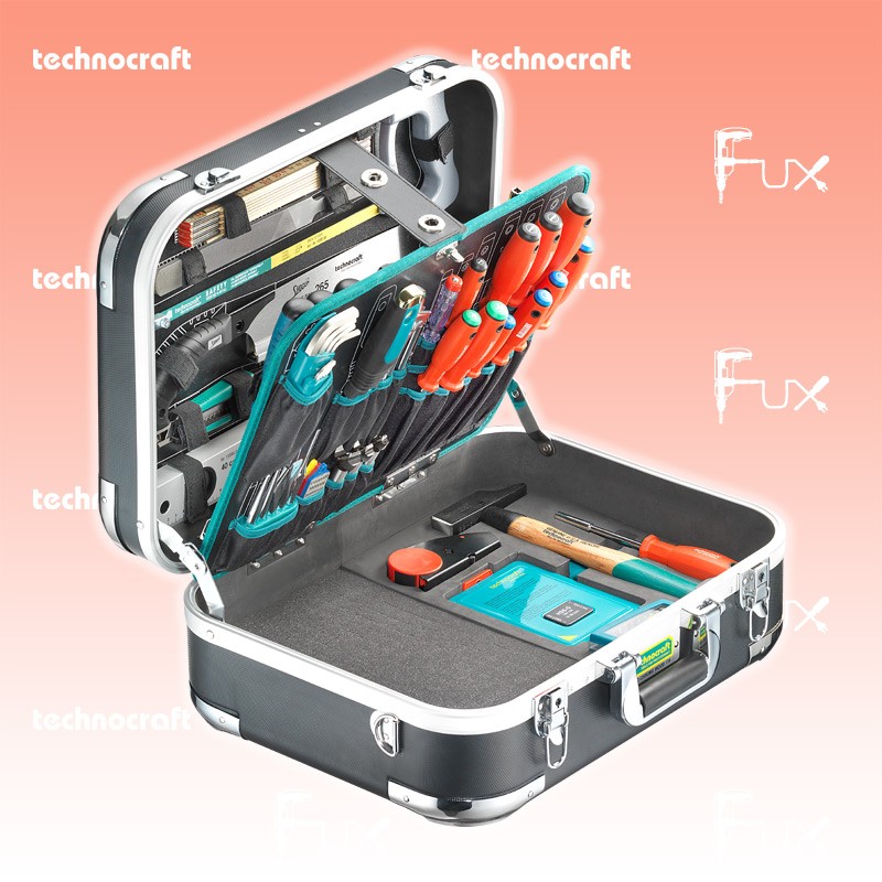 Robuster ABS-Werkzeugkoffer mit speziellem Bodenfach, welches Platz für einen Akkuschrauber mit Ladegerät oder auch für eigene Werkzeuge bietet. Der Koffer ist mit 116 Schreiner-Werkzeugen bestückt, welche speziell auf die Bedürfnisse bei Montage- und Serviceabreiten ausgewählt wurden. Mit zusätzlichem Schultertraggurt für einfaches und bequemes Tragen. Durch fi xe Einteilungen sind die Werkzeuge sicher und fest im Koffer verstaut.
