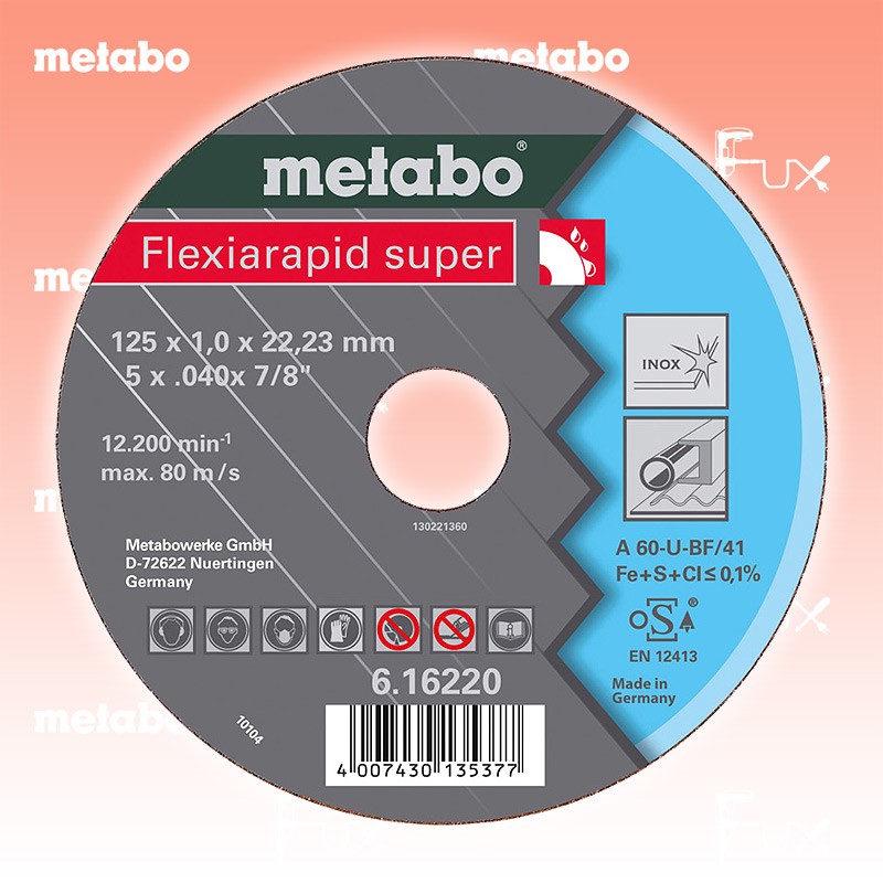 Zu "Qualitätsklasse A 36-U / A 46-U / A 60-U Trennscheiben" von Metabo Metabo Trennscheibe Stahl 180 mm Bestell- und Artikelnummer: 616227000 Die superdünne Hochleistungsscheibe speziell für die Edelstahlbearbeitung Höchste Schnittleistung bei sehr hoher Standzeit durch Verwendung von Spezialkorunden Eisen-, schwefel- und chlorfrei (Fe + S + Cl ≤ 0,1 %) Für alle rost- und säurebeständigen Stähle (V2A, Nirosta, INOX), Federstähle, Werkzeugstähle Einsetzbar im Fahrzeugbau, Behälterbau, Karosseriebau, Schaltschrankbau usw. Trennscheiben für geräuscharme, gratfreie und präzise Trennschnitte Härte: hart Arbeitshöchstgeschwindigkeit 80 m/s Technische Daten Qualitätsklasse A 46 U Durchmesser x Dicke x Bohrung 180 x 1.6 x 22.23 mm Ausführung gekröpft Max. Drehzahl 8500 Standard-Ausrüstung Verkaufseinheit 25 Stk. Listenpreis CHF 162.50 Fuxpreis CHF 138.00 inkl. 8.1% MwSt, inkl vRG Frankolieferung Kein Grauimport! Produkt bestellen Verkaufseinheit 25 Stk. 1 Stück 2 Stück 3 Stück 4 Stück 5 Stück 6 Stück 7 Stück 8 Stück 9 Stück 10 Stück 11 Stück 12 Stück 13 Stück 14 Stück 15 Stück 16 Stück 17 Stück 18 Stück 19 Stück 20 Stück 21 Stück 22 Stück 23 Stück 24 Stück 25 Stück 26 Stück 27 Stück 28 Stück 29 Stück 30 Stück 31 Stück 32 Stück 33 Stück 34 Stück 35 Stück 36 Stück 37 Stück 38 Stück 39 Stück 40 Stück 41 Stück 42 Stück 43 Stück 44 Stück 45 Stück 46 Stück 47 Stück 48 Stück 49 Stück 50 Stück Alle Angaben ohne Gewähr und solange Vorrat reicht!Wiederverkäufer werden?Lehrlingsrabatt? Produkt als PDF AKTION 15%