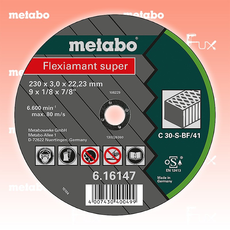 Zu "Qualitätsklasse C 30 S Trennscheiben" von Metabo Metabo Trennscheibe Stein 230 mm Bestell- und Artikelnummer: 616147000 Universalscheibe zur Bearbeitung von Natur und Kunststein Härte: mittel Hohe Schnittleistung bei hoher Standzeit Arbeitshöchstgeschwindigkeit 80 m/s Technische Daten Qualitätsklasse C 30 S Durchmesser x Dicke x Bohrung 230 x 3 x 22,23 mm Ausführung gerade Max. Drehzahl 6600 Standard-Ausrüstung Verkaufseinheit 25 Stk. Listenpreis CHF 150.00 Fuxpreis CHF 128.00 inkl. 8.1% MwSt, inkl vRG Frankolieferung Kein Grauimport! Produkt bestellen Verkaufseinheit 25 Stk. 1 Stück 2 Stück 3 Stück 4 Stück 5 Stück 6 Stück 7 Stück 8 Stück 9 Stück 10 Stück 11 Stück 12 Stück 13 Stück 14 Stück 15 Stück 16 Stück 17 Stück 18 Stück 19 Stück 20 Stück 21 Stück 22 Stück 23 Stück 24 Stück 25 Stück 26 Stück 27 Stück 28 Stück 29 Stück 30 Stück 31 Stück 32 Stück 33 Stück 34 Stück 35 Stück 36 Stück 37 Stück 38 Stück 39 Stück 40 Stück 41 Stück 42 Stück 43 Stück 44 Stück 45 Stück 46 Stück 47 Stück 48 Stück 49 Stück 50 Stück Alle Angaben ohne Gewähr und solange Vorrat reicht!Wiederverkäufer werden?Lehrlingsrabatt? Produkt als PDF AKTION 15%