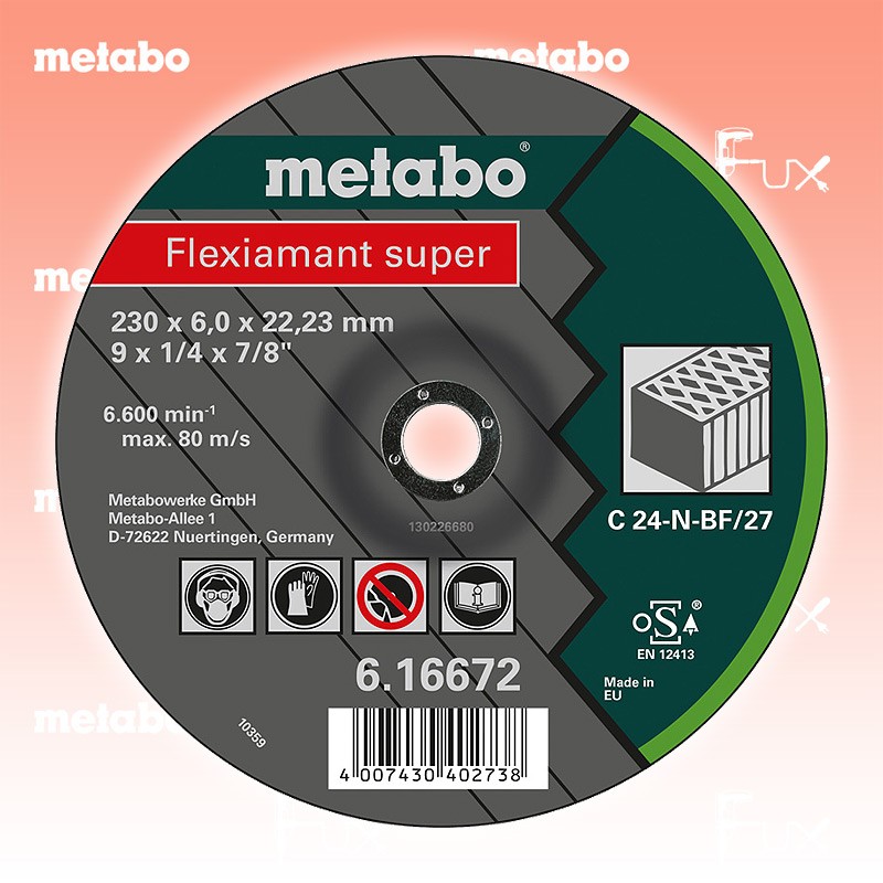 Zu "Qualitätsklasse C 24-N Schruppscheiben" von Metabo Metabo Schruppscheibe Stein 125 mm Bestell- und Artikelnummer: 616731000 Spezialscheibe für Schrupparbeiten an Beton, Natur- und Kunststein Härte: weich Hohe Abtragsleistung bei hoher Standzeit Arbeitshöchstgeschwindigkeit 80 m/s Technische Daten Qualitätsklasse C 24 N Durchmesser x Dicke x Bohrung 125 x 6 x 22,23 mm Ausführung gekröpft Max. Drehzahl 12200 / min Standard-Ausrüstung Verkaufseinheit 25 Stk. Listenpreis CHF 162.50 Fuxpreis CHF 138.00 inkl. 8.1% MwSt, inkl vRG Frankolieferung Kein Grauimport! Produkt bestellen Verkaufseinheit 25 Stk. 1 Stück 2 Stück 3 Stück 4 Stück 5 Stück 6 Stück 7 Stück 8 Stück 9 Stück 10 Stück 11 Stück 12 Stück 13 Stück 14 Stück 15 Stück 16 Stück 17 Stück 18 Stück 19 Stück 20 Stück 21 Stück 22 Stück 23 Stück 24 Stück 25 Stück 26 Stück 27 Stück 28 Stück 29 Stück 30 Stück 31 Stück 32 Stück 33 Stück 34 Stück 35 Stück 36 Stück 37 Stück 38 Stück 39 Stück 40 Stück 41 Stück 42 Stück 43 Stück 44 Stück 45 Stück 46 Stück 47 Stück 48 Stück 49 Stück 50 Stück Alle Angaben ohne Gewähr und solange Vorrat reicht!Wiederverkäufer werden?Lehrlingsrabatt? Produkt als PDF AKTION 15%