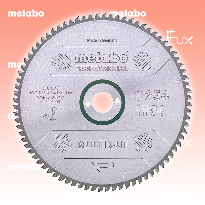 Zu "Kreissägeblätter »multi cut«" von Metabo Metabo Kreissägeblatt 300 mm professional Bestell- und Artikelnummer: 628090000 Universeller Einsatz bei anspruchsvollen Materialien Bei höchsten Ansprüchen an die Schnittqualität, z.B. Laminat, dünnwandige Kunststoff-, Alu-, Kupfer-, Messingprofile Ideal geeignet für viele Anwendungen im Innenausbau Perfekte Schnittergebnisse auch bei Querschnitten in Vollholz, rohen, beschichteten oder furnierten Spanplatten, MDF Sehr hohe Leistungskraft der Kreissäge notwendig Besonders hohe Standzeit durch beste Hartmetallqualität und feingeschliffene Zähne Präzise, geräuscharme und vibrationsminimierte Schnitte durch gelaserte Dehnschlitze (und teilweise Laserornamente), sowie gelaserte Stammblätter aus hochwertigstem Stahl Nebenlochaufnahme bei Kreissägeblättern mit den Ø 216, 250, 254 und über 300 mm (außer 628063000) Zum Kreissägeblatt-Finder Technische Daten Durchmesser x Schnittbreite x Bohrung 300 x 2.8 x 30 mm Material HW/CT Zähnezahl 96 Zahnform FZ/TZ Stammblattdicke 2.2 mm Spanwinkel 6° neg. geeignet für PK 300 / PKV 300 G bis 1996 Verpackung Karton Standard-Ausrüstung Verkaufseinheit 1 Stk. Listenpreis CHF 224.00 Fuxpreis CHF 190.00 inkl. 8.1% MwSt, inkl vRG Frankolieferung Kein Grauimport! Produkt bestellen Verkaufseinheit 1 Stk. 1 Stück 2 Stück 3 Stück 4 Stück 5 Stück 6 Stück 7 Stück 8 Stück 9 Stück 10 Stück 11 Stück 12 Stück 13 Stück 14 Stück 15 Stück 16 Stück 17 Stück 18 Stück 19 Stück 20 Stück 21 Stück 22 Stück 23 Stück 24 Stück 25 Stück 26 Stück 27 Stück 28 Stück 29 Stück 30 Stück 31 Stück 32 Stück 33 Stück 34 Stück 35 Stück 36 Stück 37 Stück 38 Stück 39 Stück 40 Stück 41 Stück 42 Stück 43 Stück 44 Stück 45 Stück 46 Stück 47 Stück 48 Stück 49 Stück 50 Stück Alle Angaben ohne Gewähr und solange Vorrat reicht!Wiederverkäufer werden?Lehrlingsrabatt? Produkt als PDF AKTION 15%